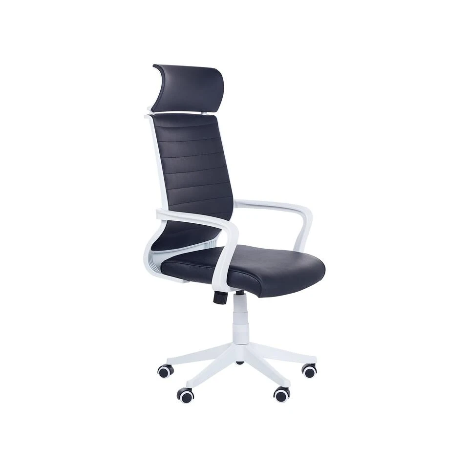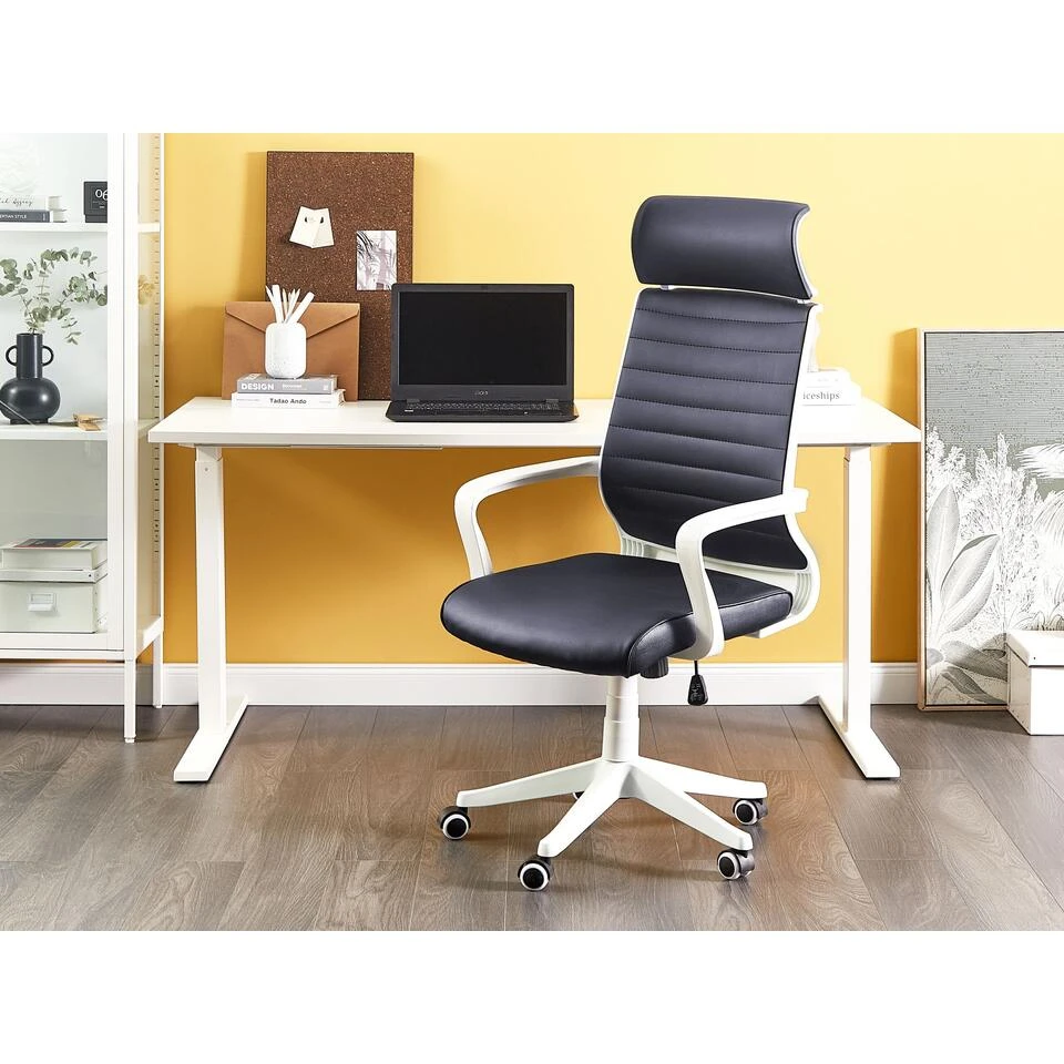 Moderne bureaustoel met hoge rugleuning. Maak je werkkamer of kantoor comfortabeler met deze bureaustoel met hoge rugleuning. Deze stoel past perfect bij elke moderne of minimalistische inrichting. De rugleuning is gemaakt van gemakkelijk te onderhouden polyester mesh stof. Het kantelmechanisme en de verstelbare zithoogte zorgen ervoor dat de stoel comfort biedt tijdens lange uren werken of gamen. De nylon wielen rollen soepel over de vloer, zonder krassen achter te laten. Dankzij het stevige metalen frame biedt de stoel stabiliteit en jarenlang gebruiksgemak.