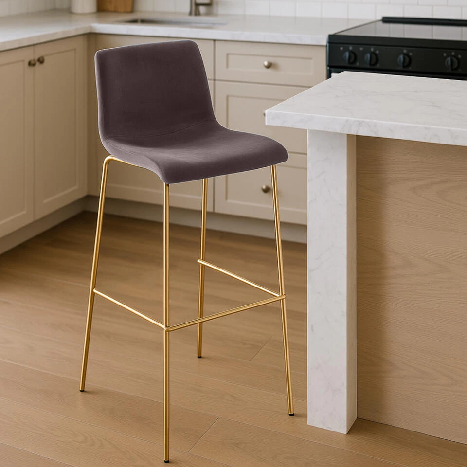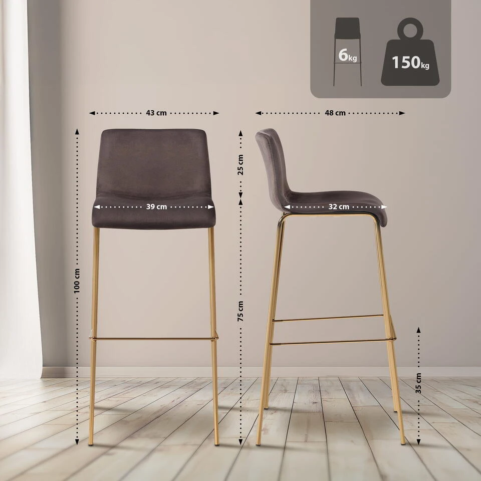 De kruk dankt zijn elegante uiterlijk aan de stijlvolle combinatie van elegante fluwelen bekleding en een glanzend goudkleurig frame.