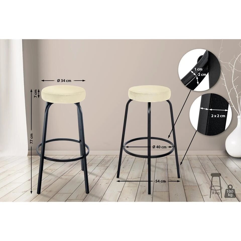 Details:Totale hoogte: 78 cmTotale breedte: 41 cmTotale diepte: 41 cmZithoogte: 78 cmZittingoppervlak: Ø 34 cmGewicht: 8 kgMateriaalsamenstelling: 100% polyester (fluweel), 100% polyurethaan (kunstleer)