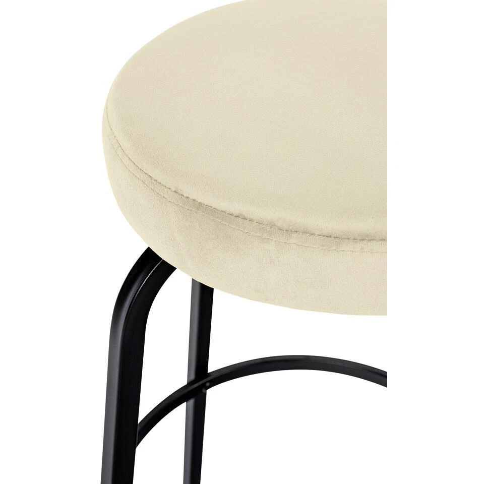 De Kamari barkruk maakt indruk met zijn tijdloze combinatie van een ronde gestoffeerde zitting en een matzwart metalen onderstel met vier poten.