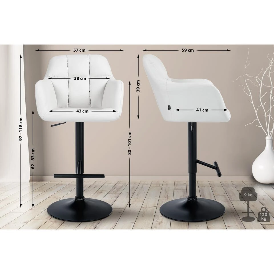De barkruk Natoma kunstleer wordt gekenmerkt door zijn functionele ontwerp en zitcomfort. Dankzij de hoogteverstelling van 97 tot 118 cm, een breedte van 57 cm en een diepte van 59 cm kan hij worden aangepast aan een breed scala aan barhoogtes. De zitting en rugleuning van 43 x 41 cm zijn ontworpen om steun en comfort te bieden. Armleuningen en een voetsteun op de trompetvoet dragen bij aan de functionaliteit, terwijl de vloerbeschermer schade aan het oppervlak voorkomt. Met een gewicht van 9 kg en een draagvermogen tot 120 kg is de Natoma-barkruk een stevige stoel. De 360° draaifunctie bevordert ook de mobiliteit en flexibiliteit.