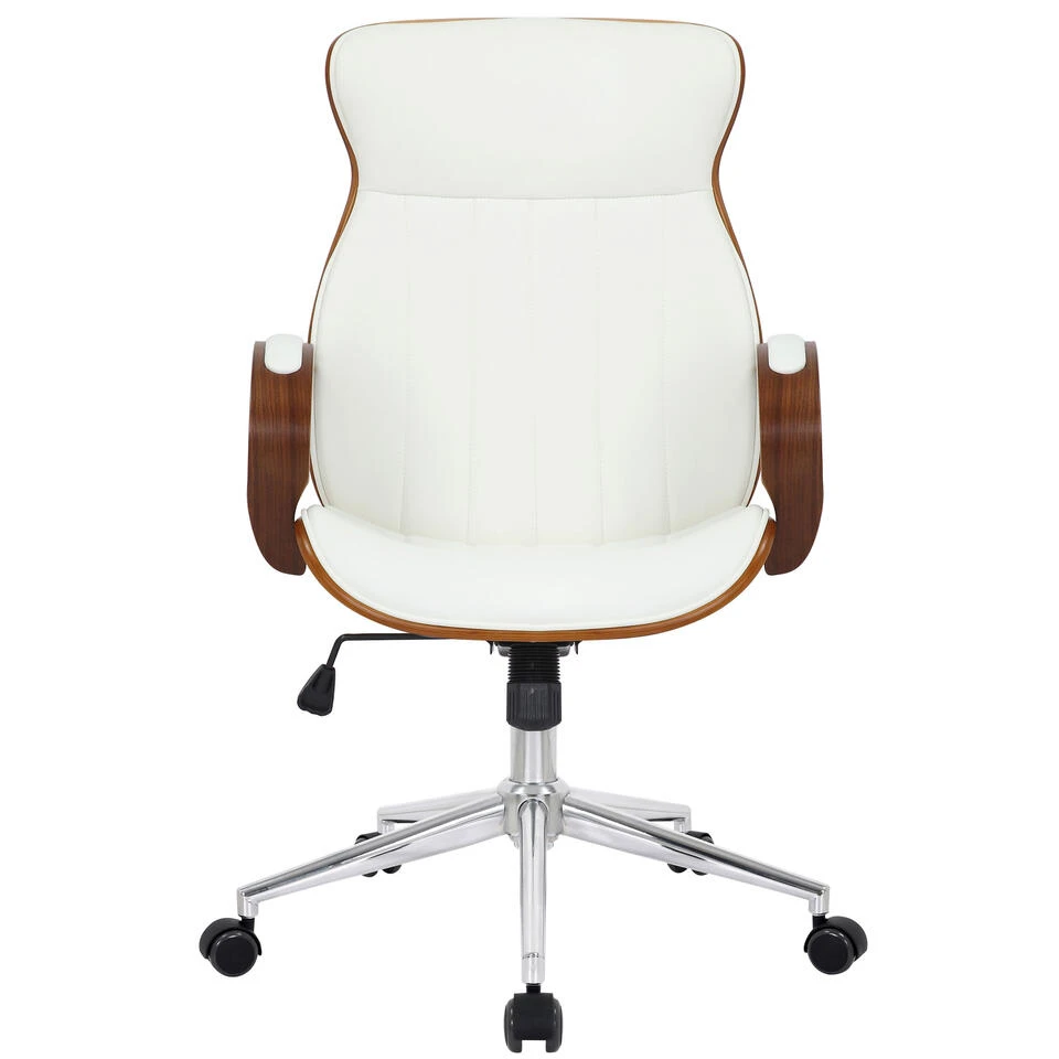 Deze bureaustoel heeft een zeer hoogwaardige kunstlederen bekleding. De kunstlederen hoes heeft het voordeel dat hij elastisch is en weer glad worden als ze ontlast worden. Dit ziet er niet alleen mooier uit, maar verlengt ook de levensduur van de stoelbekleding. Het houten frame maakt deze bureaustoel tot een absolute blikvanger en geeft hem een nobel design. Dankzij de traploze zithoogte is ergonomisch zitten gegarandeerd en zorgt het ingebouwde kantelmechanisme voor meer bewegingsvrijheid. Het frame is gemaakt van metaal in chroomlook en is zeer stabiel. De bureaustoel staat stevig op vijf zwenkwielen.