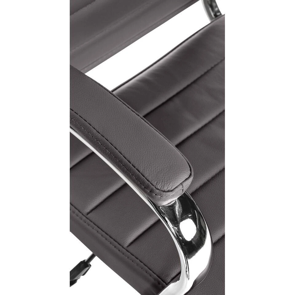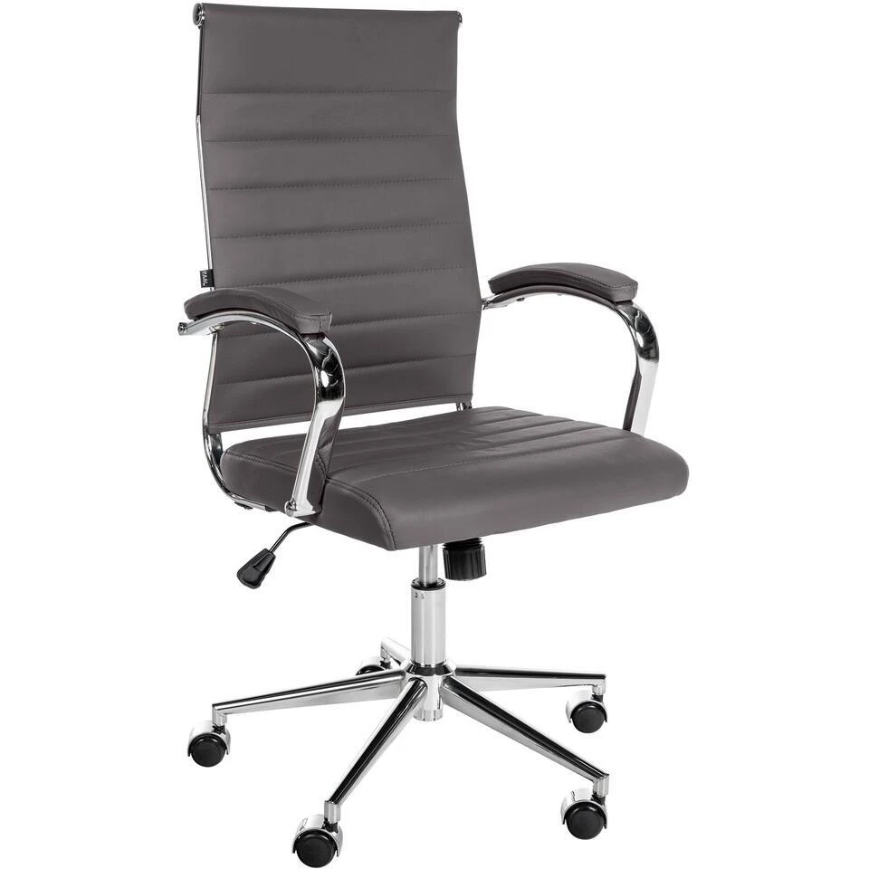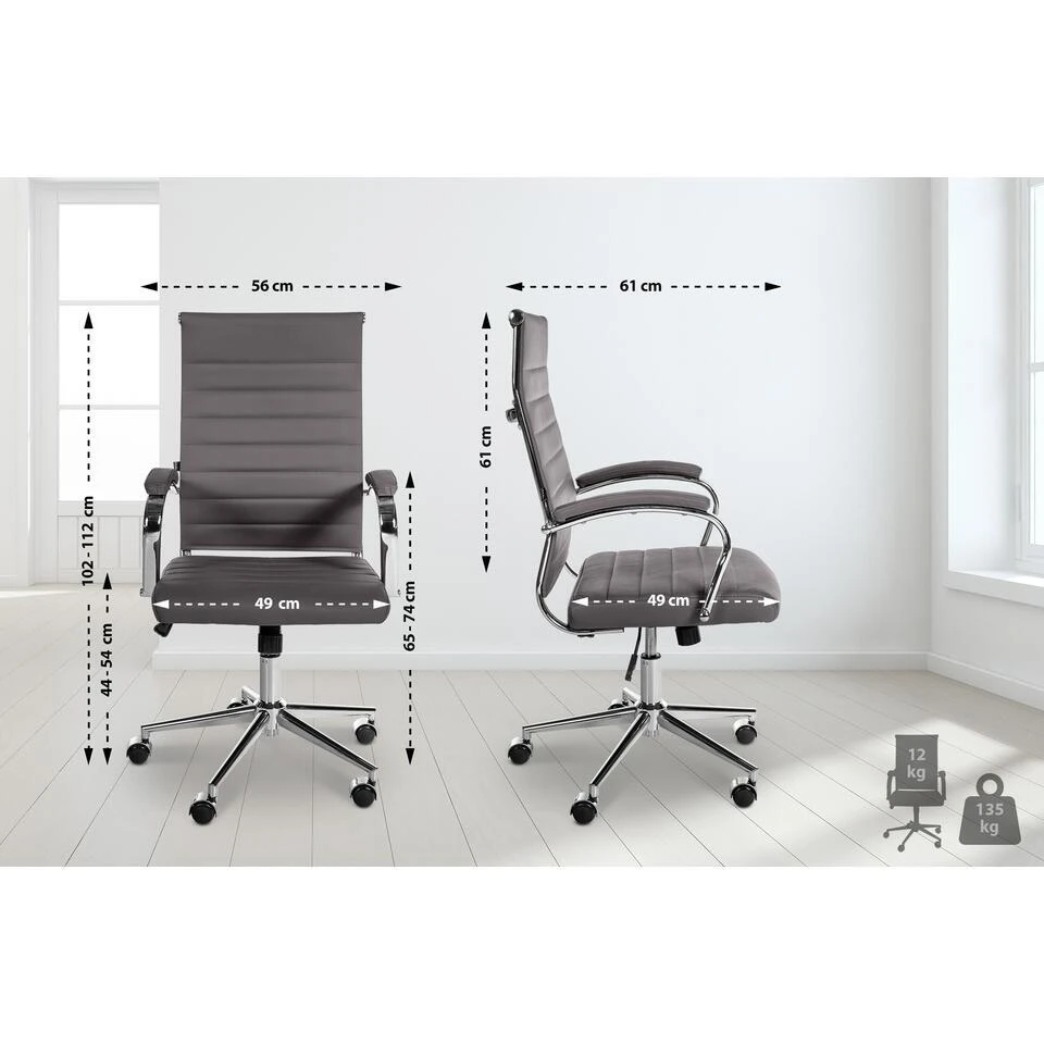 Het robuuste metalen frame met chromen look zorgt voor stabiliteit en elegantie. Deze bureaustoel is uitgerust met zwenkwielen en kan een gewicht tot 135 kilo dragen.