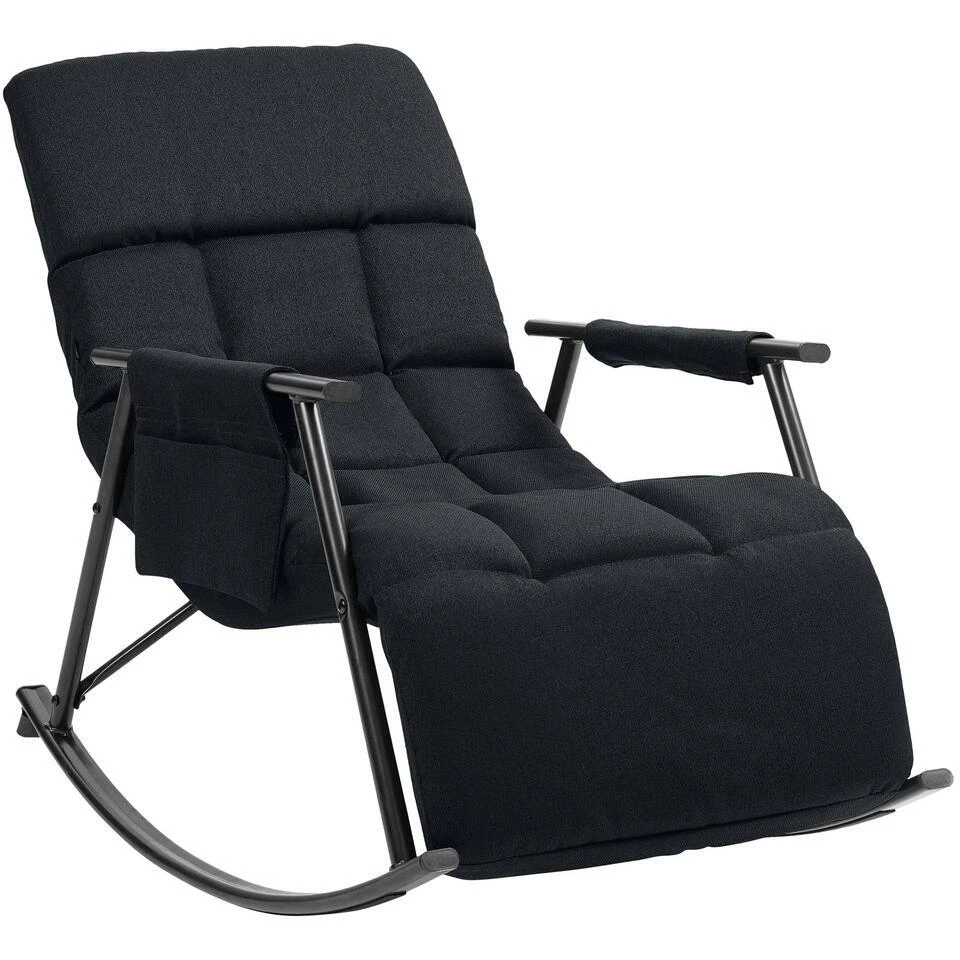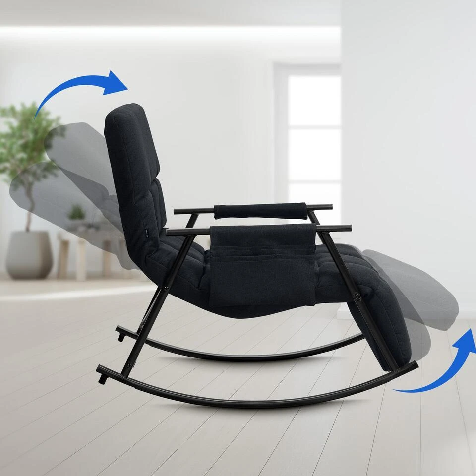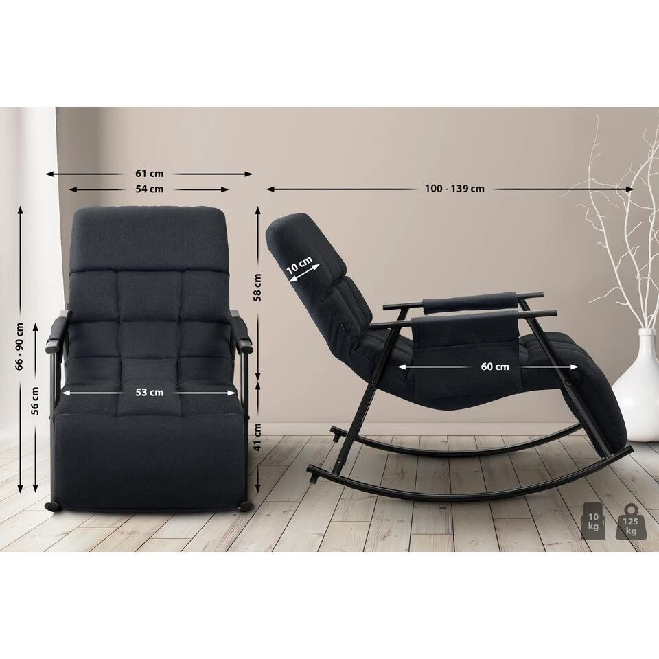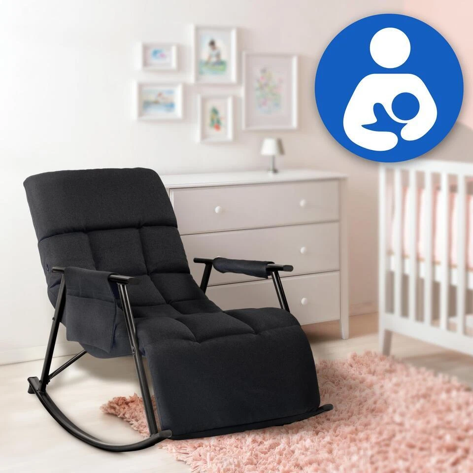 De bekleding met modieus doorgestikt patroon is verkrijgbaar met een stoffen of fluwelen hoes. Het gepoedercoate metalen frame draagt bij aan de moderne uitstraling en hoge stabiliteit. De schommelstoel kan een gewicht tot 125 kilo veilig dragen.