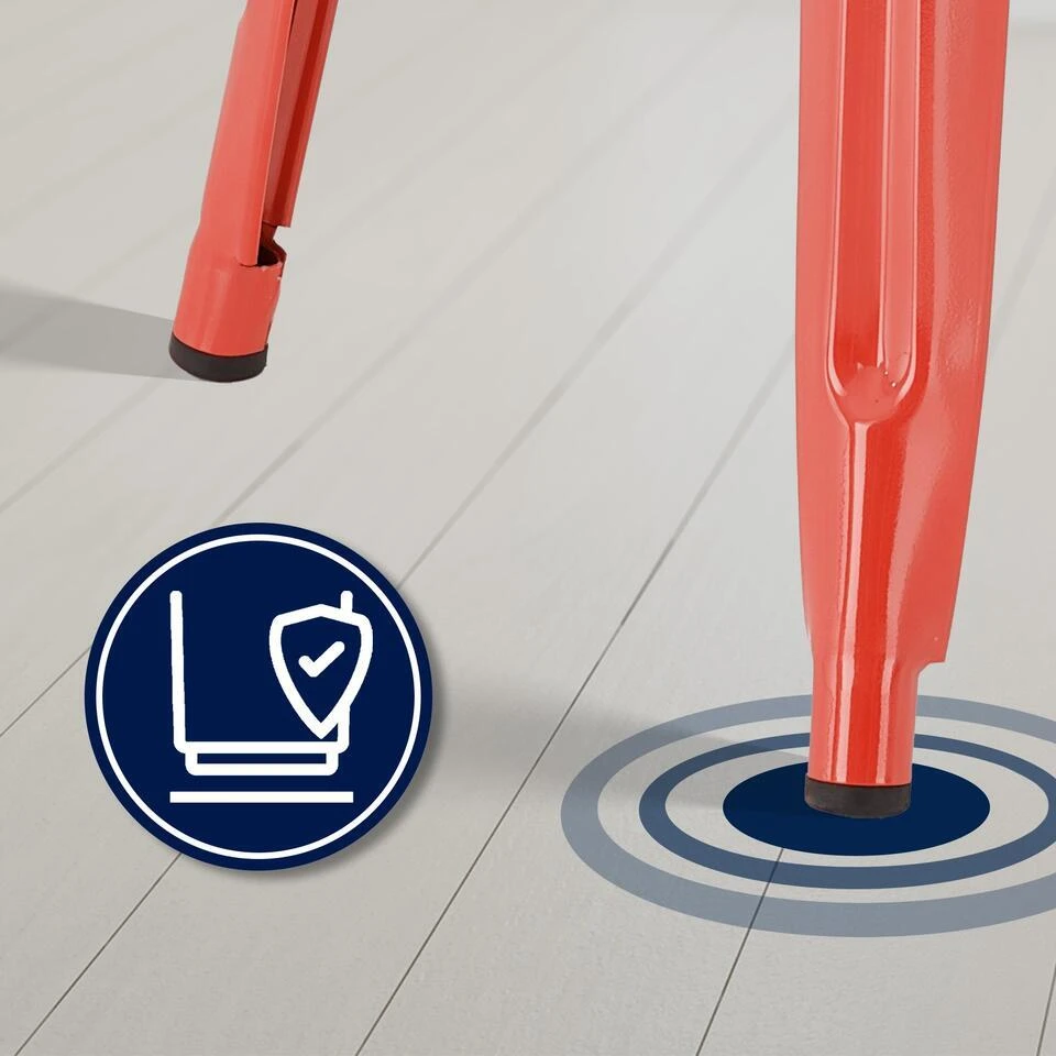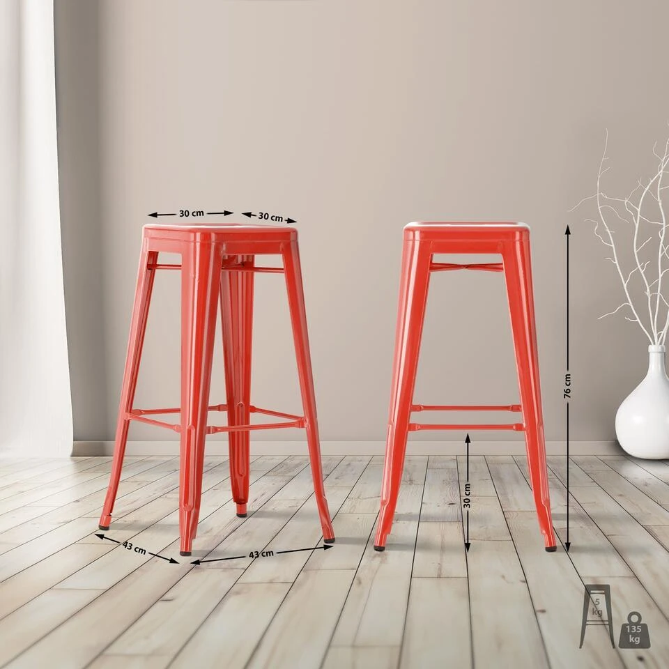 Deze barkruk van gepoedercoat metaal is altijd stabiel. Zowel tussen de benen als onder de zitting zijn er dwarsbalken die voor een hoge stabiliteit zorgen, de eerste dienen ook als een comfortabele voetsteun.