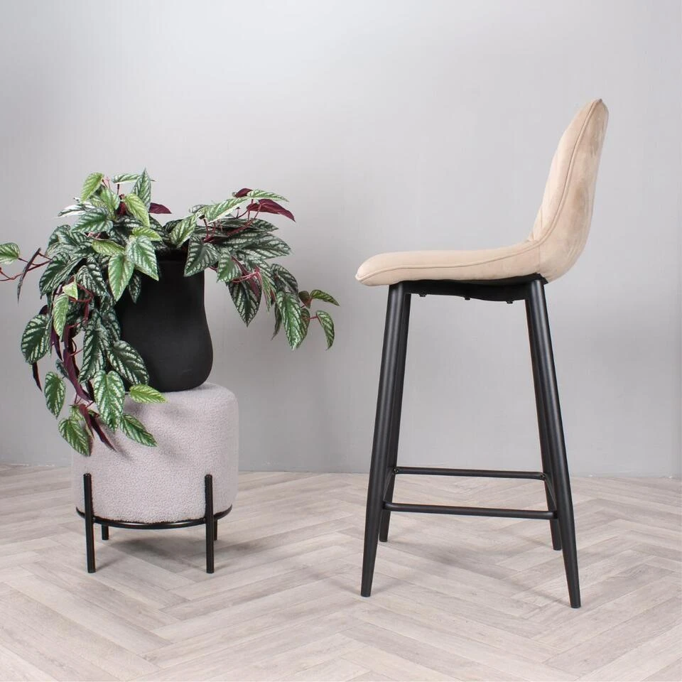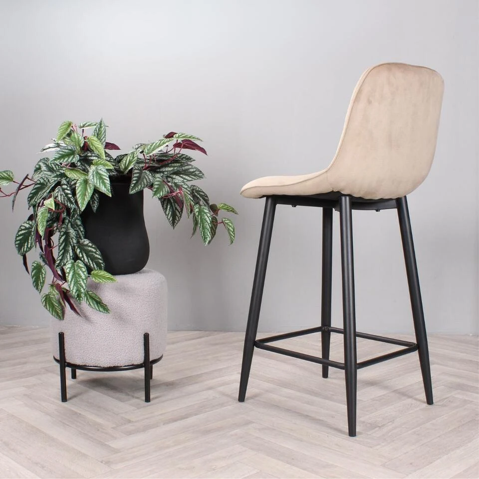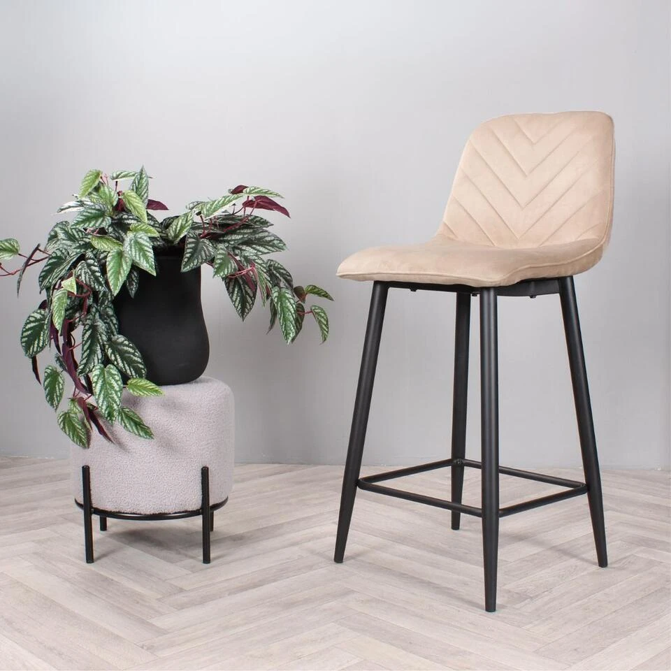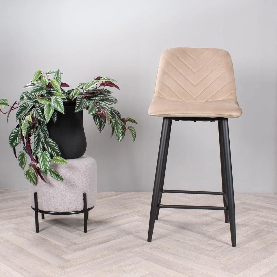 Geef uw interieur een stijlvolle en trendy make-over met barkruk Gaby uit onze eigen collectie! Deze prachtige barstoel is bekleed met een heerlijk zachte velvet stof. Gaby is verkrijgbaar in diverse mooie kleuren; groen, bruin, zwart, champagne en roze. Dankzij de halfhoge rugleuning en het zachte zitvlak, kan er heerlijk lang op deze kruk gezeten worden. Opvallend aan zijn ontwerp zijn de visgraat sierstiksels over de binnenzijde van de rugleuning voor een speelse finishing touch. Om dit exemplaar compleet te maken, is hij voorzien van vier stevige zwarte metalen poten met een handige voetensteun. Plaats barkruk Gaby aan het kookeiland en geniet van zijn design en comfort. Barkruk Gaby is verkrijgbaar in een zithoogte van 65 cm en 75 cm en ook als eetkamerstoel en armstoel in dezelfde mooie kleuren. Let op de kleuren van de eetkamerstoelen en barkruk kunnen afwijken. Zithoogte: 65 cm.