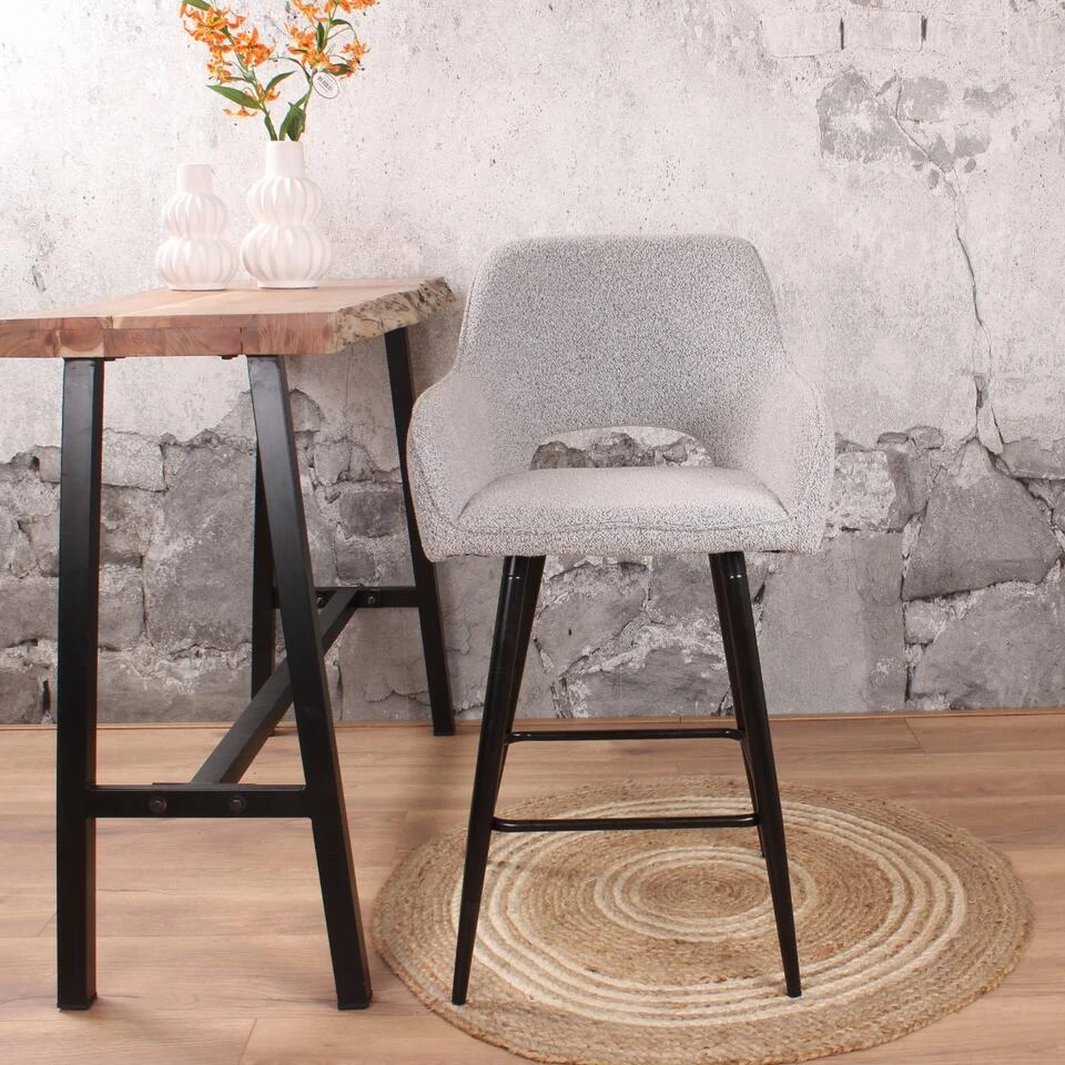 Geniet van deze prachtige barstoel van onze eigen collectie DS4U. Deze Lenon barkruk in bouclé is absoluut favoriet! Onze eigen barkruk Lenon heeft een moderne uitstraling. Daarnaast zit hij extreem comfortabele zit. Lenon is voorzien van lage armleuningen en een opening in de achterzijde voor een openlijke look. Lenon is verkrijgbaar in drie mooie kleuren bouclé en als eetkamerstoel. Combineer deze items samen voor eenheid in het interieur. Het onderstel bestaat uit vier poten en horizontale stang ter ondersteuning van de voeten. Het onderstel is gemaakt van metaal in zwarte afwerking. Breng rust en eenvoud naar jouw interieur met onze prachtige Lenon-serie!