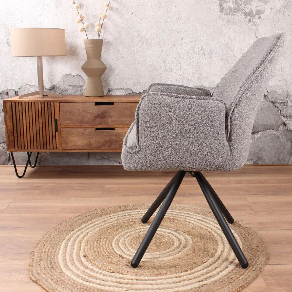 Stijlvol, comfortabel en stoer! Dat zijn de kenmerken van Lucio. Het bijzondere van deze eetkamerstoel is dat hij draaibaar is. De zitting van deze stoel is bekleed met een mooie boucle stof. Daarnaast is de rugleuning voorzien van een sierlijk ruitpatroon. Het onderstel van deze armstoel bestaat uit vier zwarte poten vanuit het midden. Deze poot is erg stevig. Tussen het onderstel en de zitting zit de draaischijf waarmee de stoel makkelijk draait. Om deze stoel extra comfort te geven is hij uitgevoerd met armleuningen. Deze stoel komt perfect tot zijn recht in een industrieel, modern, landelijk of vintage interieur. Lucio is verkrijgbaar in drie populaire kleuren boucle: wit, beige en grijs. Daarnaast is hij verkrijgbaar met een velvet bekleding.