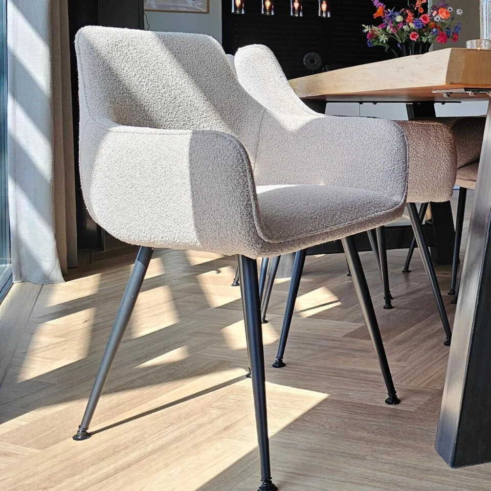 De geliefde Ravi eetkamerstoel 3.0 in een nieuw (zacht) jasje. Deze Ravi eetkamerstoel is bekleed met een prachtige bouclé stof. Dit geeft deze comfortabel eetkamerstoel een chique uitstraling, helemaal van deze tijd. Ravi bouclé is verkrijgbaar in wit, grijs of beige. Voor ieder wat wils. De zitting is bevestigd op een stevig metalen onderstel in de kleur zwart. Bouclé is helemaal van nu, deze eetkamerstoel past dan ook binnen een Scandinavisch, tijdloos en modern interieur. De stof voelt heerlijk zacht aan en heeft een prettige uitstraling. Daarnaast is Ravi ook verkrijgbaar in zes kleuren velvet en in de variant zonder armleuning (Benito 3.0).