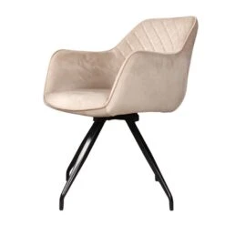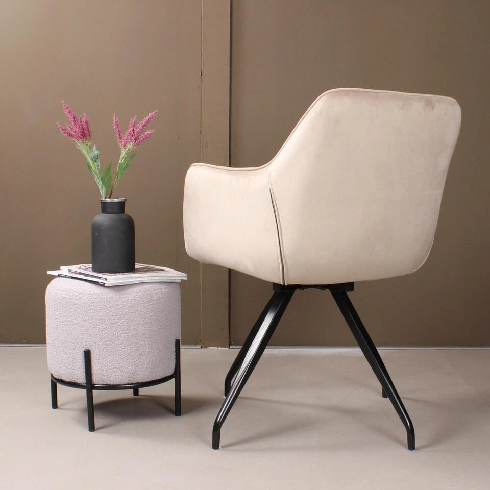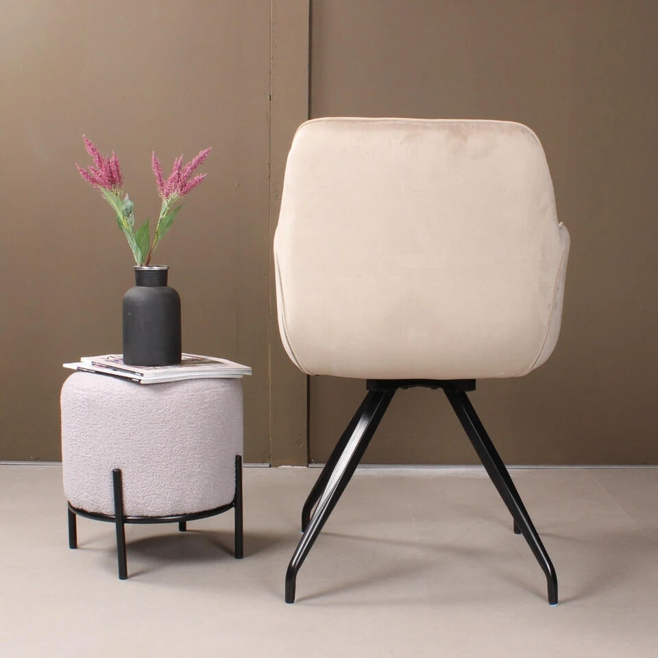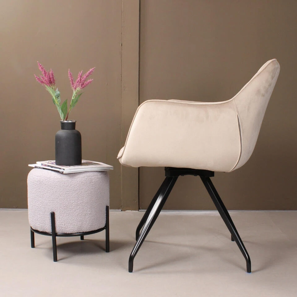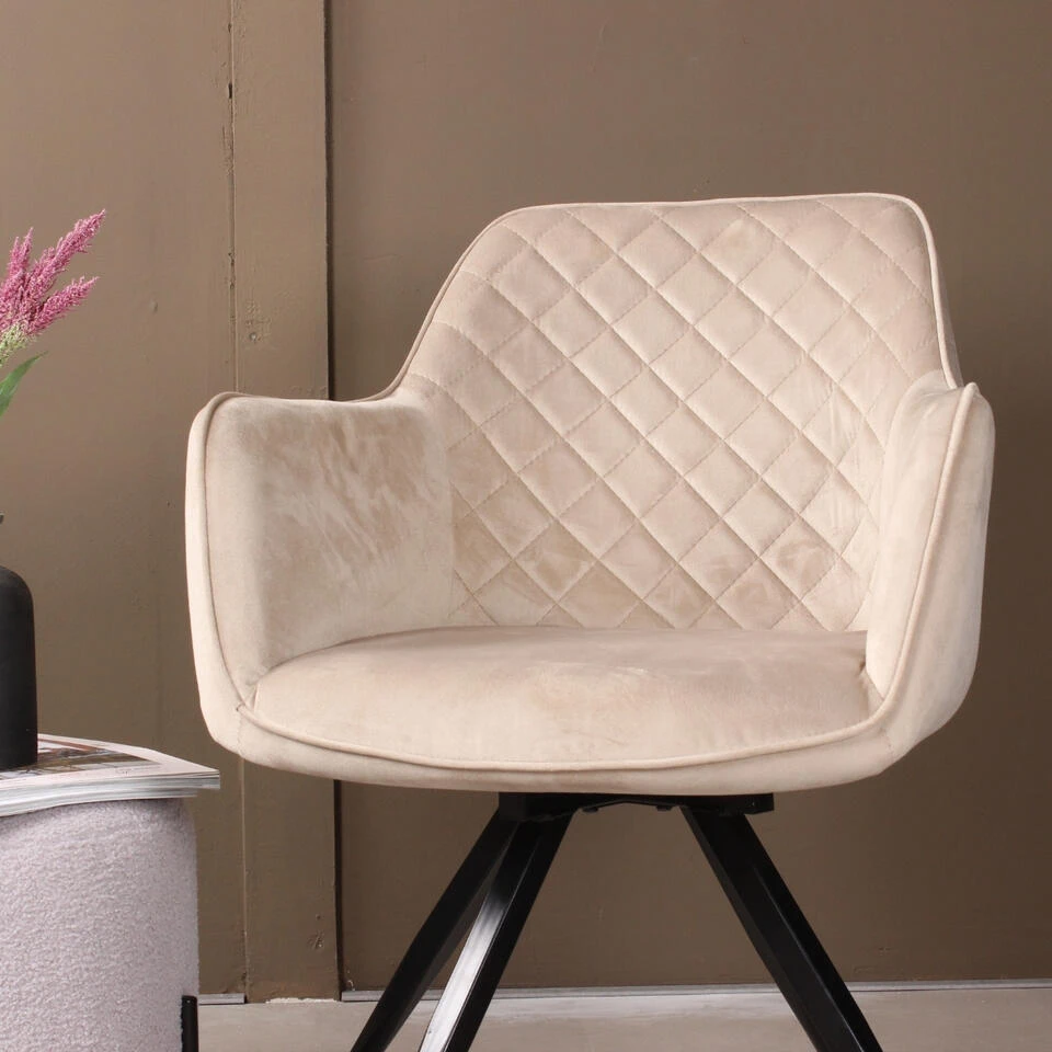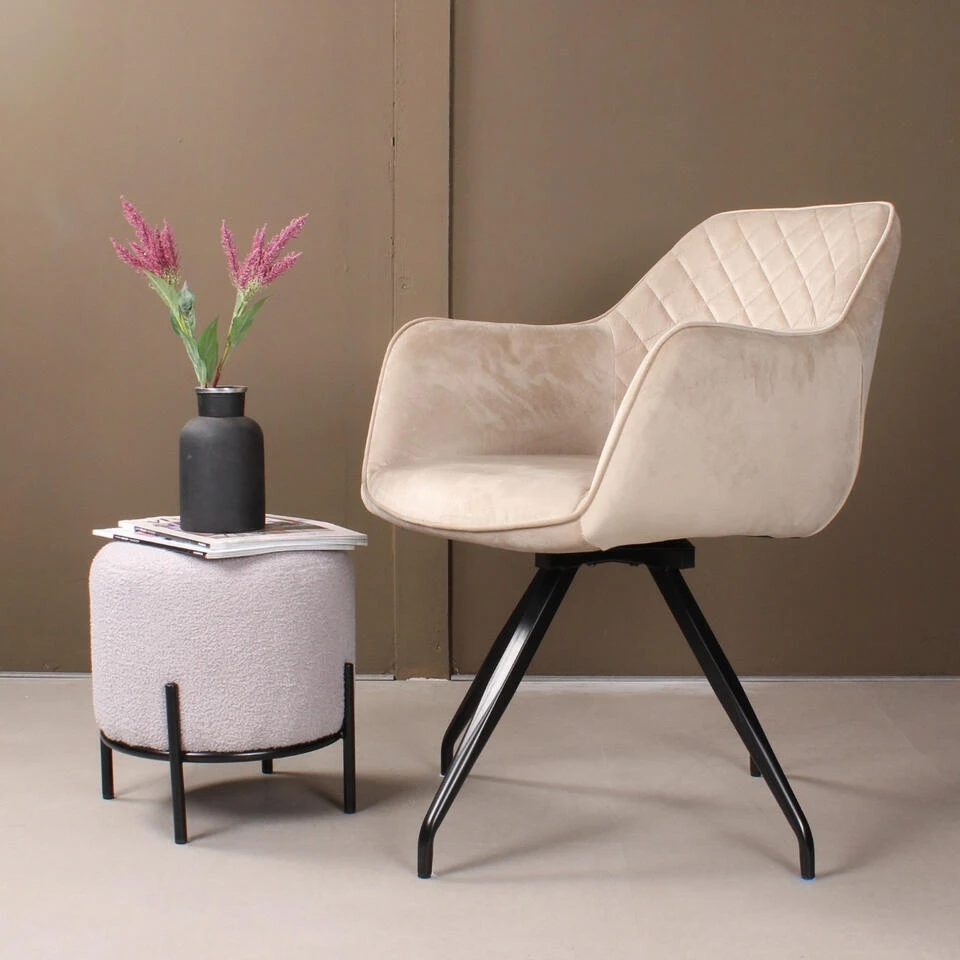 Romy armstoel velvet 2.0 heeft een luxueuze uitstraling en is uiterst comfortabel. Daarnaast is deze stoel ook nog 180 graden draaibaar. Dit zorgt ervoor dat er niet met stoelen geschoven hoeft te worden. Je stapt makkelijk in en uit de stoel. Daarnaast draait de stoel zelf weer terug naar zijn oorspronkelijke positie. Ideaal! De zitting is bekleed met zacht velvet voor een fijn zitcomfort. De rugleuning is voorzien van een geruit stiksel. Romy armstoel velvet 2.0 is verkrijgbaar in vier hippe kleuren: champagne, zwart, donkergroen en goud. De stoel staat op een stevige vierpoot van zwart gepoedercoat staal. Doordat Romy 2.0 voorzien is van armleuningen is het mogelijk uren na te tafelen met je favoriete tafelgasten.