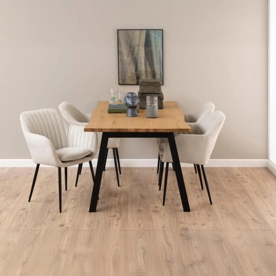 Materiaal: De zitting van de Fiska stoel is gemaakt van hoogwaardig stof/textiel, wat zorgt voor een zachte en comfortabele zitervaring. Het stalen frame biedt de nodige stevigheid en stabiliteit, waardoor de stoel niet alleen stijlvol maar ook duurzaam is.