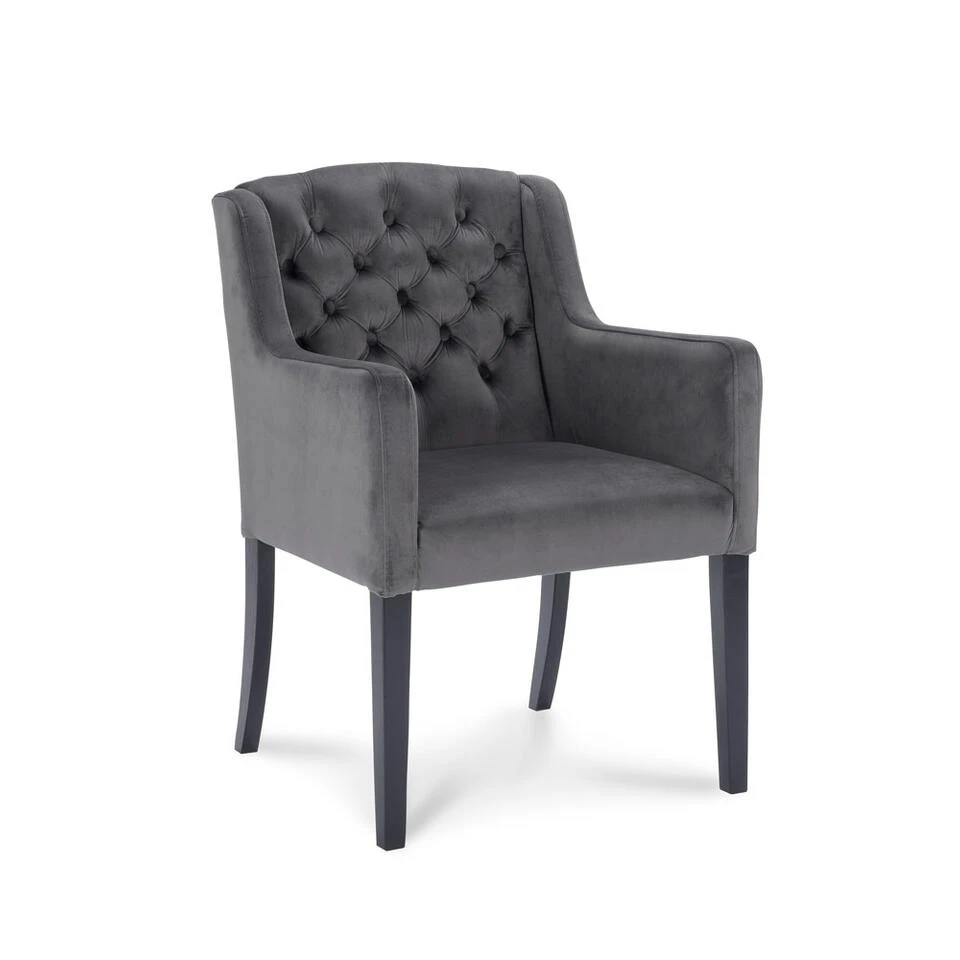 Eetkamerstoel Rosetti met armleuningen is een landelijke gecapitonneerde stoel met een trendy hippe velours/velvet stof in de kleur grijs. De stoel is uitgevoerd met stoere zwarte eikenhouten poten. Is stoel Rosetti echt iets voor jou, maar wil je hem liever in een andere kleur? Bekijk de verschillende mogelijkheden, want hij is verkrijgbaar in meerdere velvet/velours kleuren.