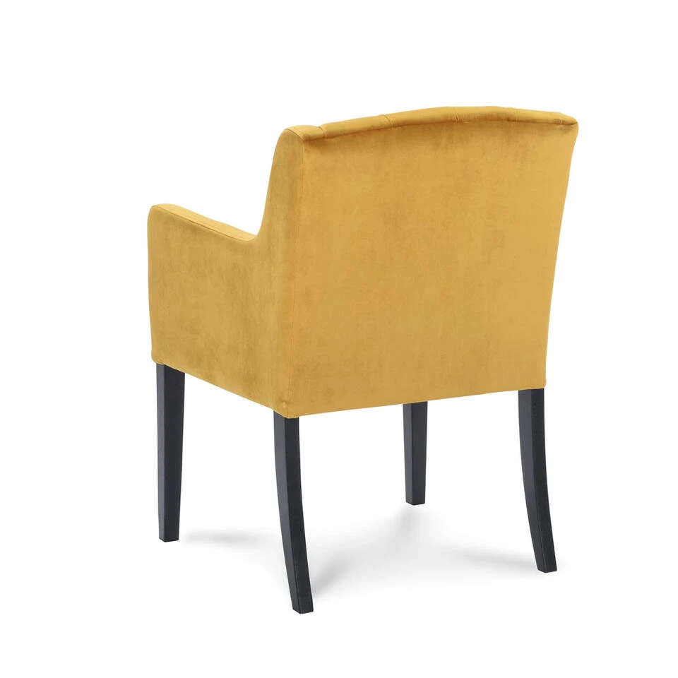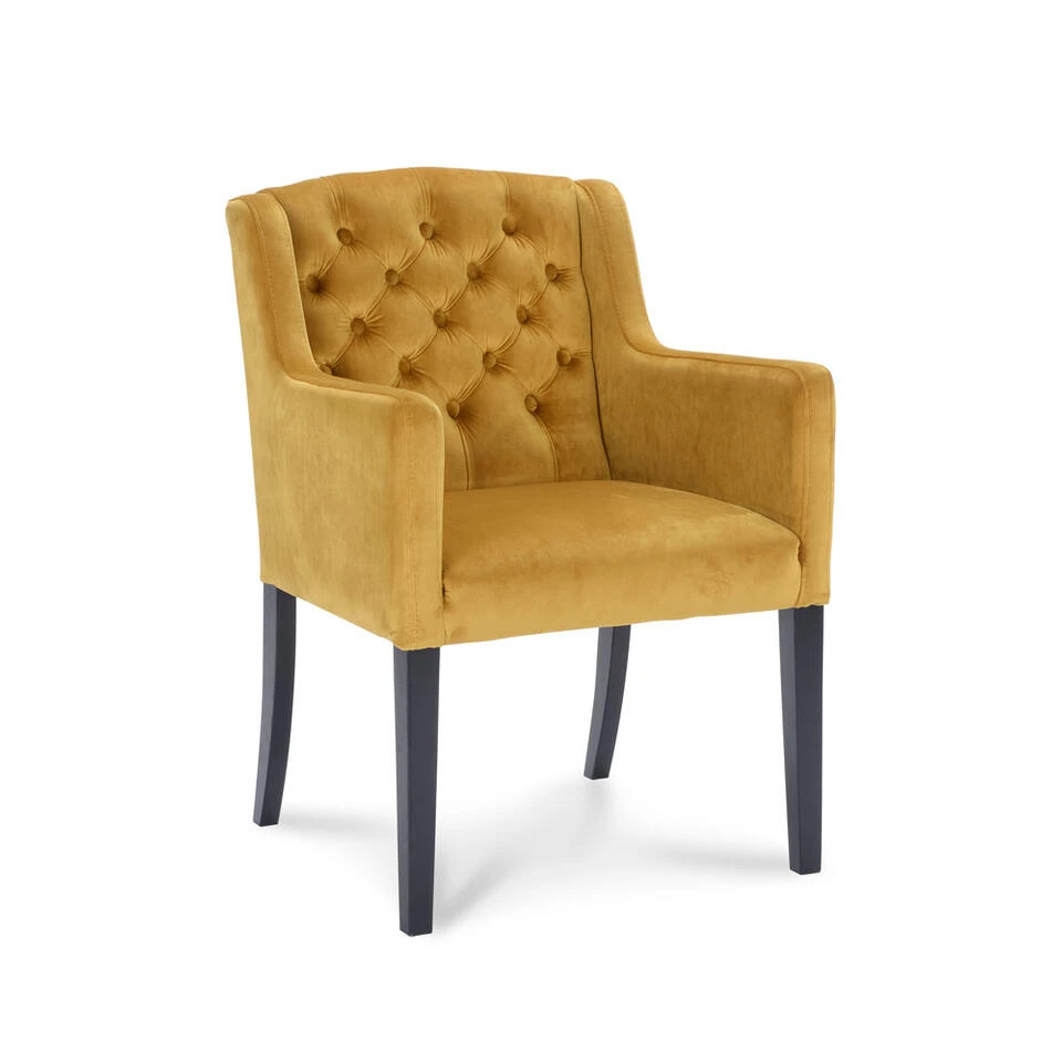 Eetkamerstoel Rosetti met armleuningen is een landelijke gecapitonneerde stoel met een trendy hippe velours/velvet stof in de kleur oker. De stoel is uitgevoerd met stoere zwarte eikenhouten poten. Is stoel Rosetti echt iets voor jou, maar wil je hem liever in een andere kleur? Bekijk de verschillende mogelijkheden, want hij is verkrijgbaar in meerdere velvet/velours kleuren.