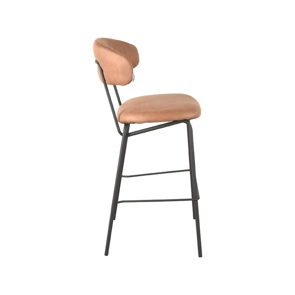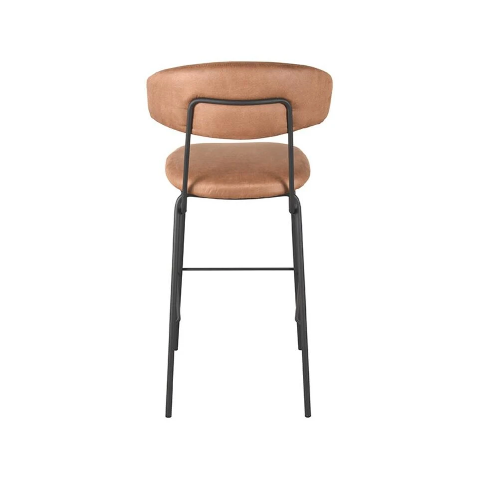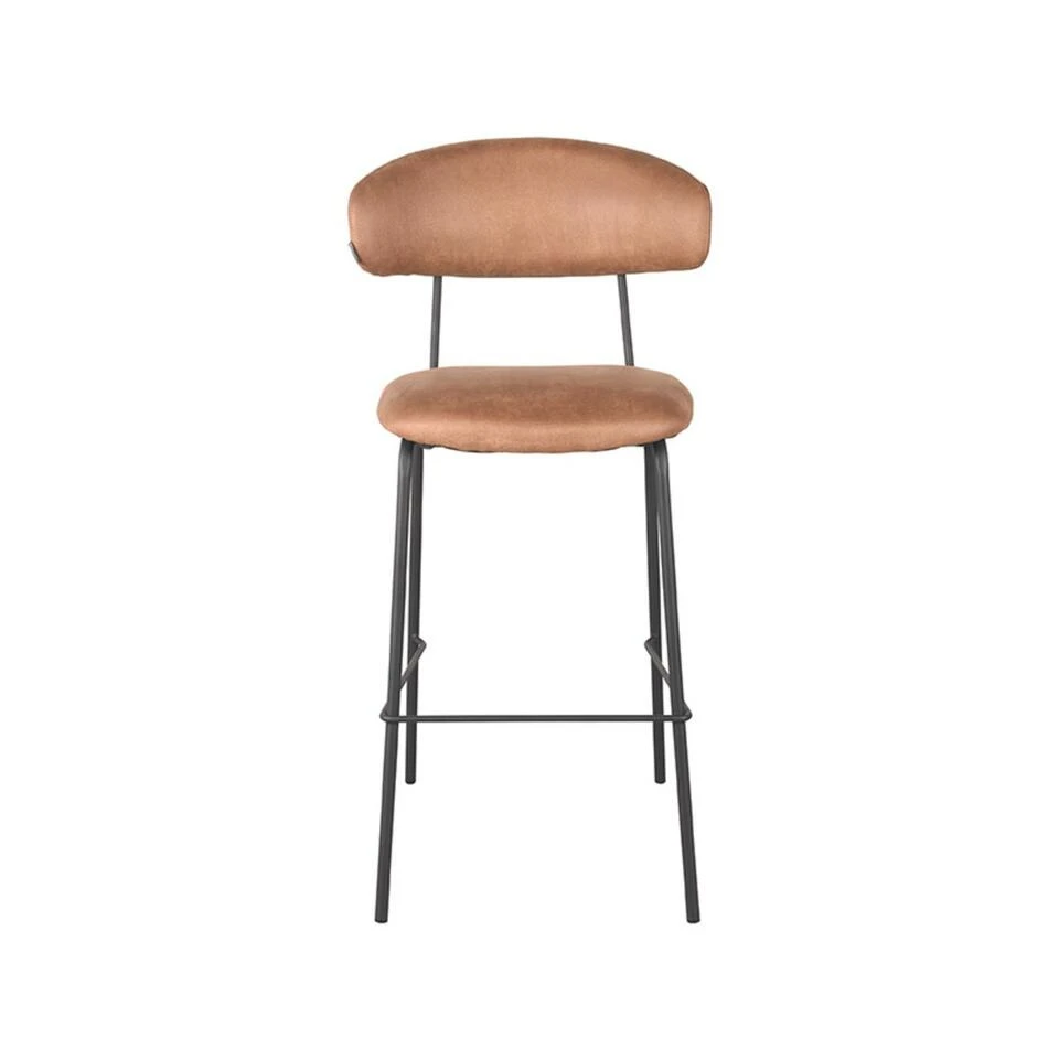 Barkruk Zack is uitgevoerd in cognac micro suède, een bruinkleurige stof met een hele subtiele structuur en duurzaam van aard. Zack bestaat uit een ronde, aparte rugleuning en zitting, die verbonden zijn door een prachtig doorlopend zwart frame, voorzien van een handgreep op de achterkant van de rugleuning. Dit maakt Zack extra functioneel waardoor het aanschuiven van deze eetkamerstoel nog makkelijker wordt. De vier zwarte poten, voorzien van een opstap zorgen voor extra stabiliteit en een luchtige look.