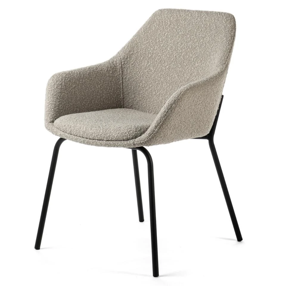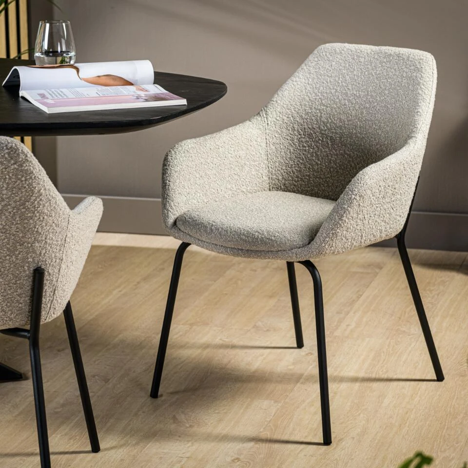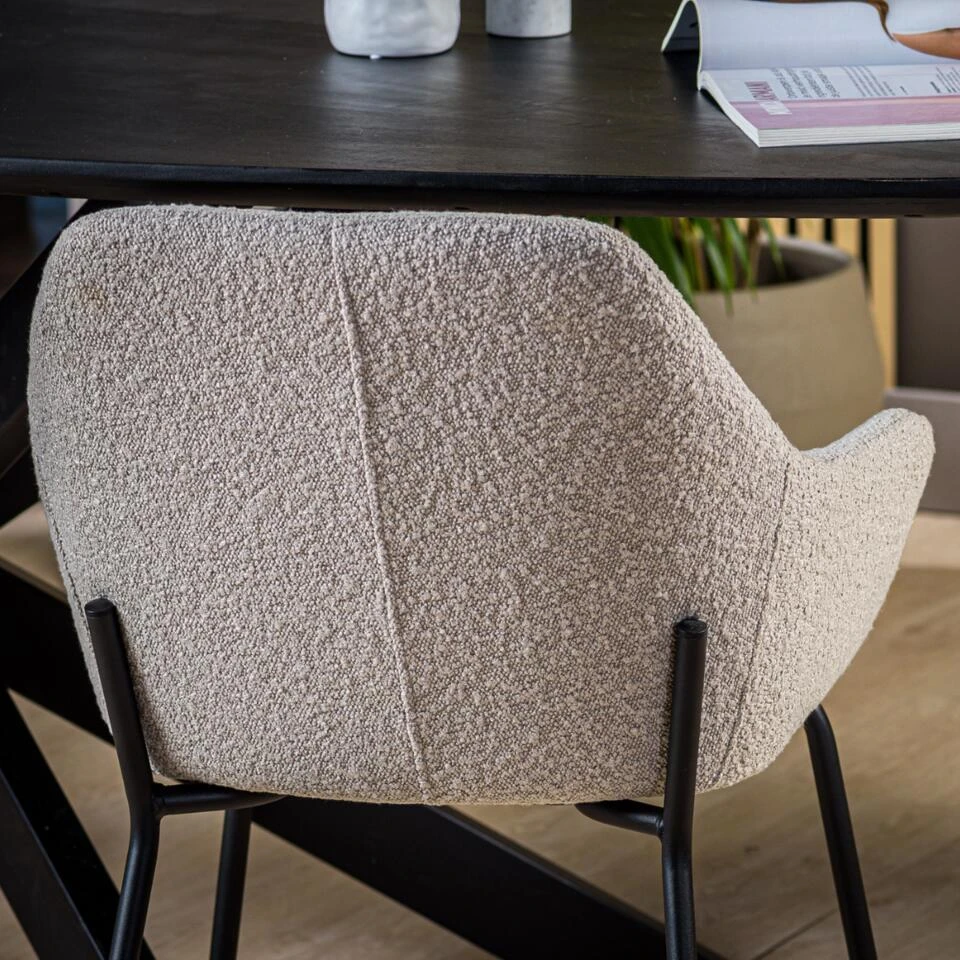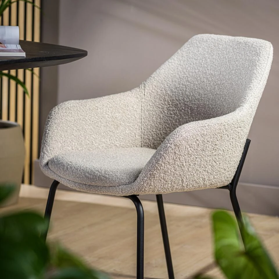 Een eetkamerstoel helemaal van deze tijd; dat is onze Mayem armstoel! Mayem is bekleed met een zachte bouclé stof in de populaire naturel-kleur. Door de combinatie van bouclé en naturel past deze neutrale eetkamerstoel in diverse woonstijlen. Van modern, tot hotel chique en van landelijk tot industrieel. Plaats Mayem aan jouw eettafel en geniet urenlang met jouw favoriete gezelschap aan tafel. Mayem is voorzien van een hoge rugleuning en armleuning, waardoor je heerlijk in deze stoel kunt zitten. Het onderstel is gemaakt van stevig, zwart metaal. De poten zijn sierlijk en slank wat de een extra chique uitstraling. Ben jij op zoek naar een mooie eetkamerstoel met armleuning in een naturel bouclé stof? Dan is Mayem echt iets voor jou!