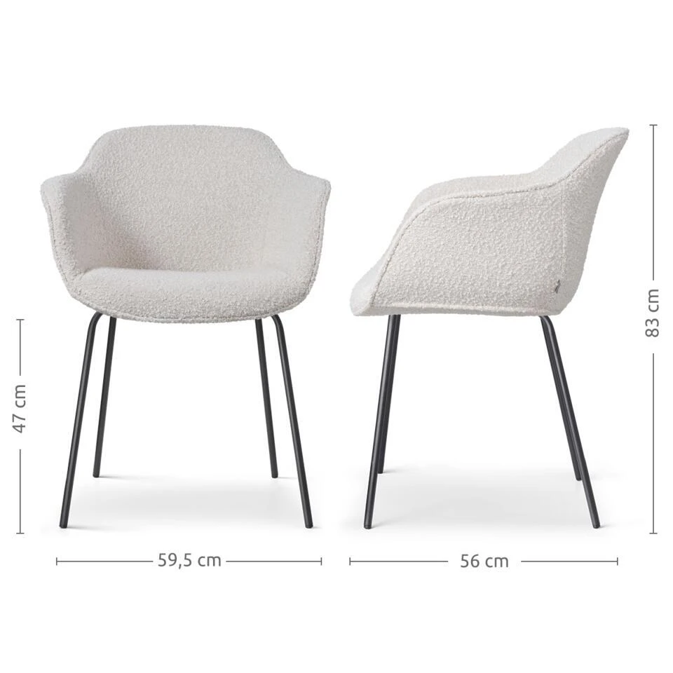Het tijdloze en sfeervolle ontwerp van deze stoel tilt iedere eetruimte moeiteloos naar een hoger niveau. De kuipzitting met armleuningen biedt niet alleen een stijlvolle uitstraling, maar garandeert ook ultiem comfort tijdens elke maaltijd. De bouclé bekleding zorgt voor een zachte zitervaring en is daarnaast ook slijtvast, waardoor deze stoel perfect past in de eethoek die vaak wordt gebruikt. De subtiele rondingen en zachte lijnen van de zitting dragen bij aan een warm en uitnodigend karakter. Dankzij het slanke en minimalistische metalen onderstel past deze eetkamerstoel bovendien bij iedere woonstijl, of je nu kiest voor een Scandinavisch of industrieel interieur.