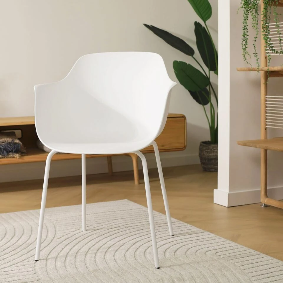 Deze kuipstoel biedt een comfortabele zitervaring dankzij de kunststof zitting die licht flexibel is en de schuin aflopende armleuningen. Het stevige metalen onderstel met witte poten zorgt voor stabiliteit en voegt een strakke, eigentijdse uitstraling toe aan je eetruimte. Met een totale hoogte van 82 cm, een zithoogte van 45 cm en een zitdiepte van 46 cm, is deze stoel perfect voor lange diners en gezellige avonden aan tafel. De Nora-Puk is niet draaibaar, wat bijdraagt aan de eenvoudige en functionele uitstraling. Deze eetkamerstoel zonder opsmuk past moeiteloos in verschillende interieurstijlen en is bovendien onderhoudsvriendelijk dankzij de duurzame materialen. Zoek je een stijlvolle, praktische stoel die zowel functioneel als esthetisch aantrekkelijk is? Dan is de Nora-Puk eetkamerstoel wit met wit onderstel een uitstekende keuze.