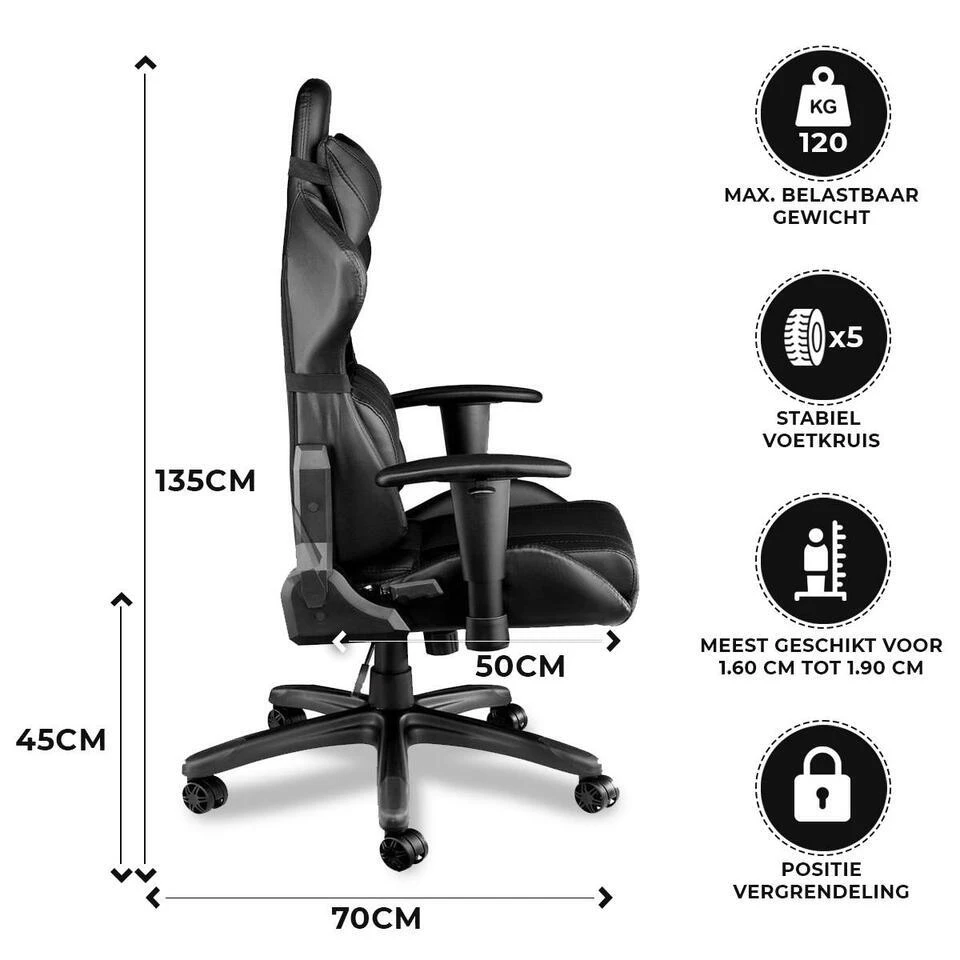 Ergonomisch ontwerp: De gaming stoel heeft een hoge rugleuning van 83 cm die naast je rug, ook je nek en hoofd ondersteunt. De hoek van de rugleuning is naar wens verstelbaar. Je kunt hierbij zelf de keuze maken tussen een actieve werkhouding of toch juist meer de relax stand. De gaming stoel heeft een verstelbare lendenkussen en hoofdsteunkussen, de kussens bieden extra ondersteuning voor jouw perfecte eigen houding.