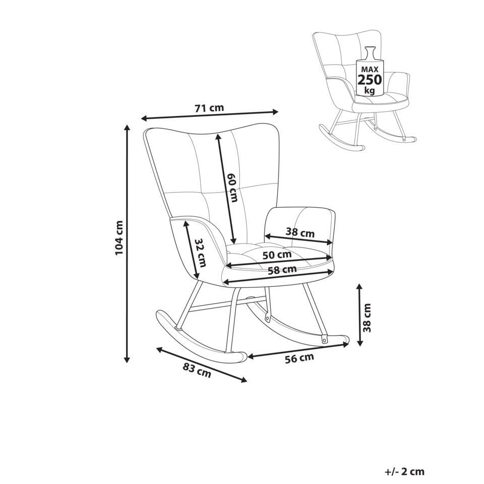 Belangrijkste eigenschappen: Schommelfunctie, Perfect gevormde armleuningen, Gezellige uitstraling, Past uitstekend in elk interieur, Hoogwaardige kwaliteit stoffering, Robuust frame