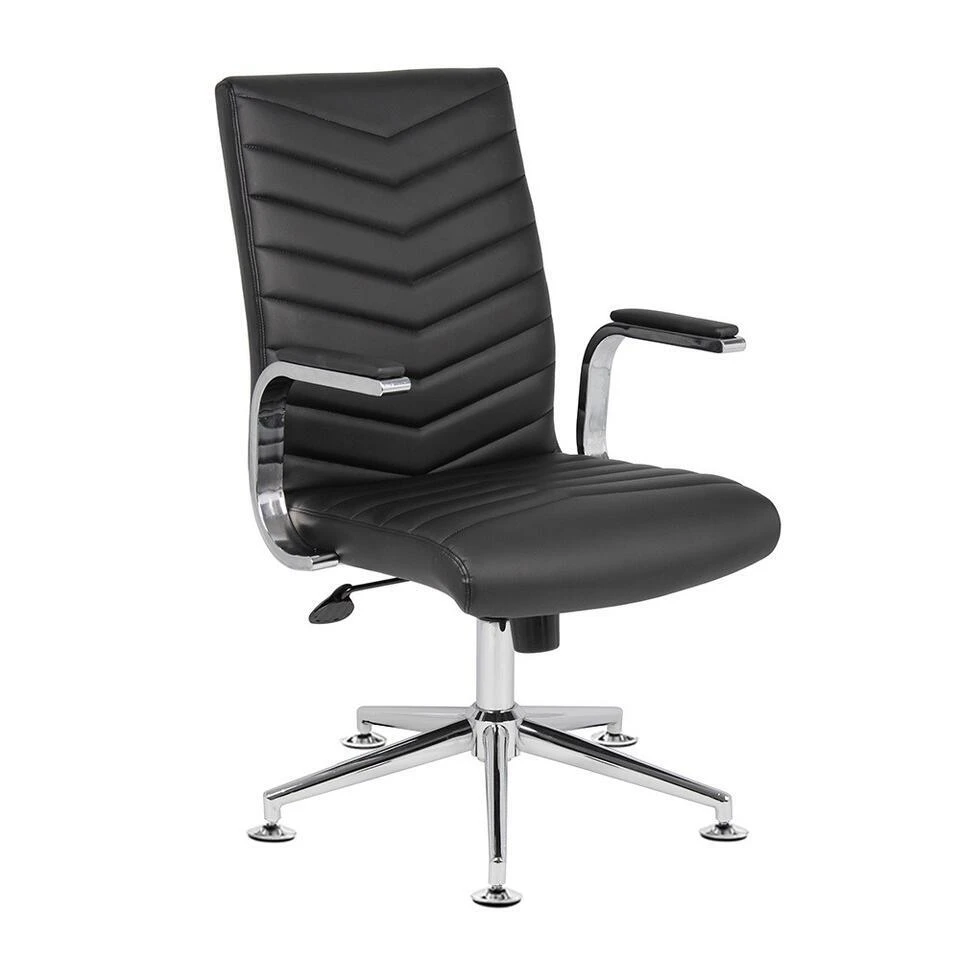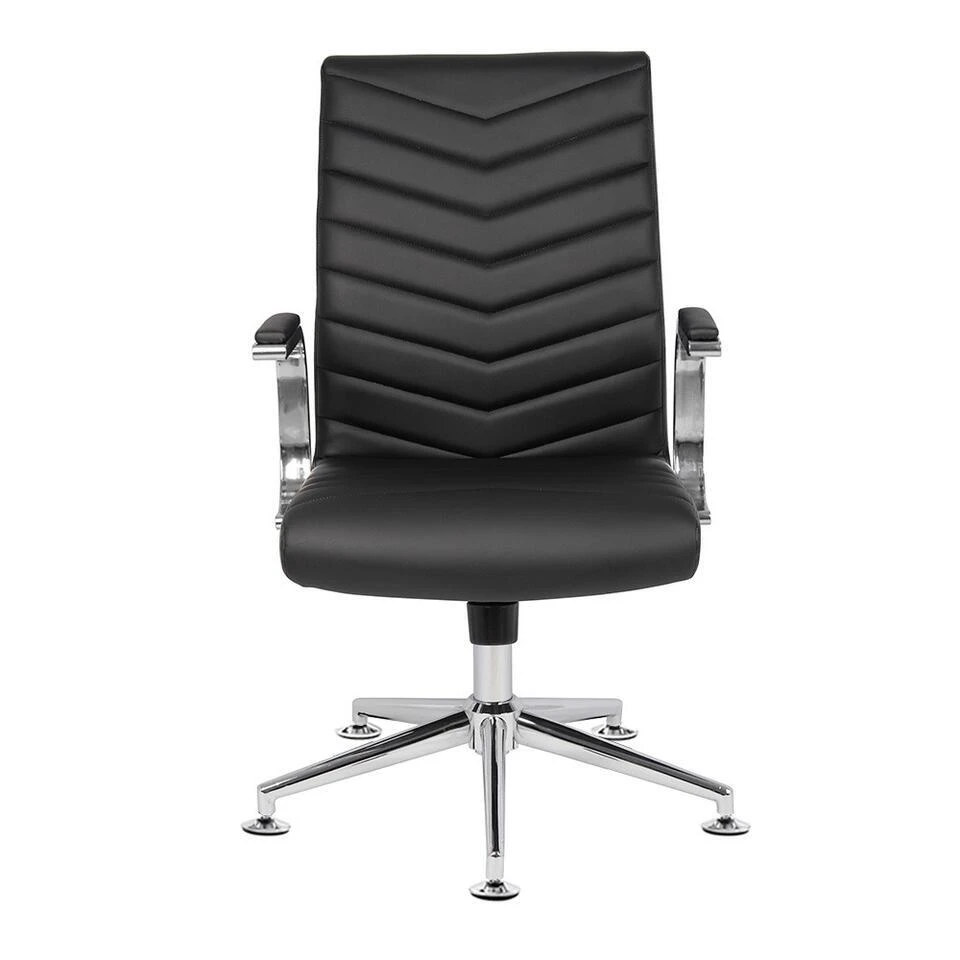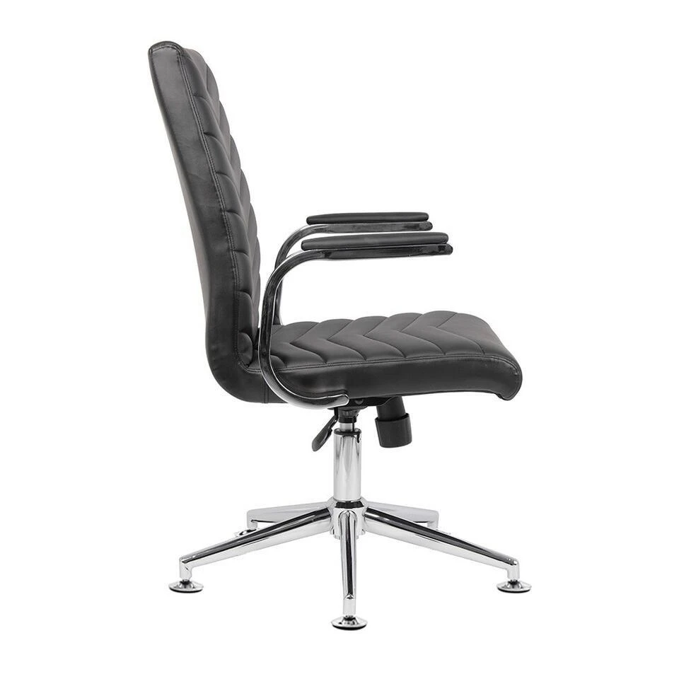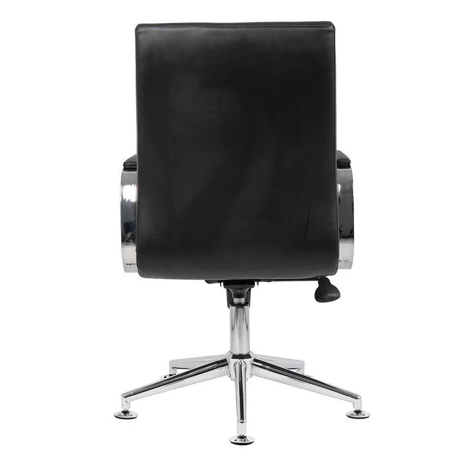 De kantoorstoel dankt zijn chique uitstaling aan het chroomkleurige frame. De vaste armleuningen hebben zachte kussentjes, wat zorgt voor extra comfort. De stoel is geschikt voor diverse interieurs en is een echte eyecatcher in jouw vergaderruimte.