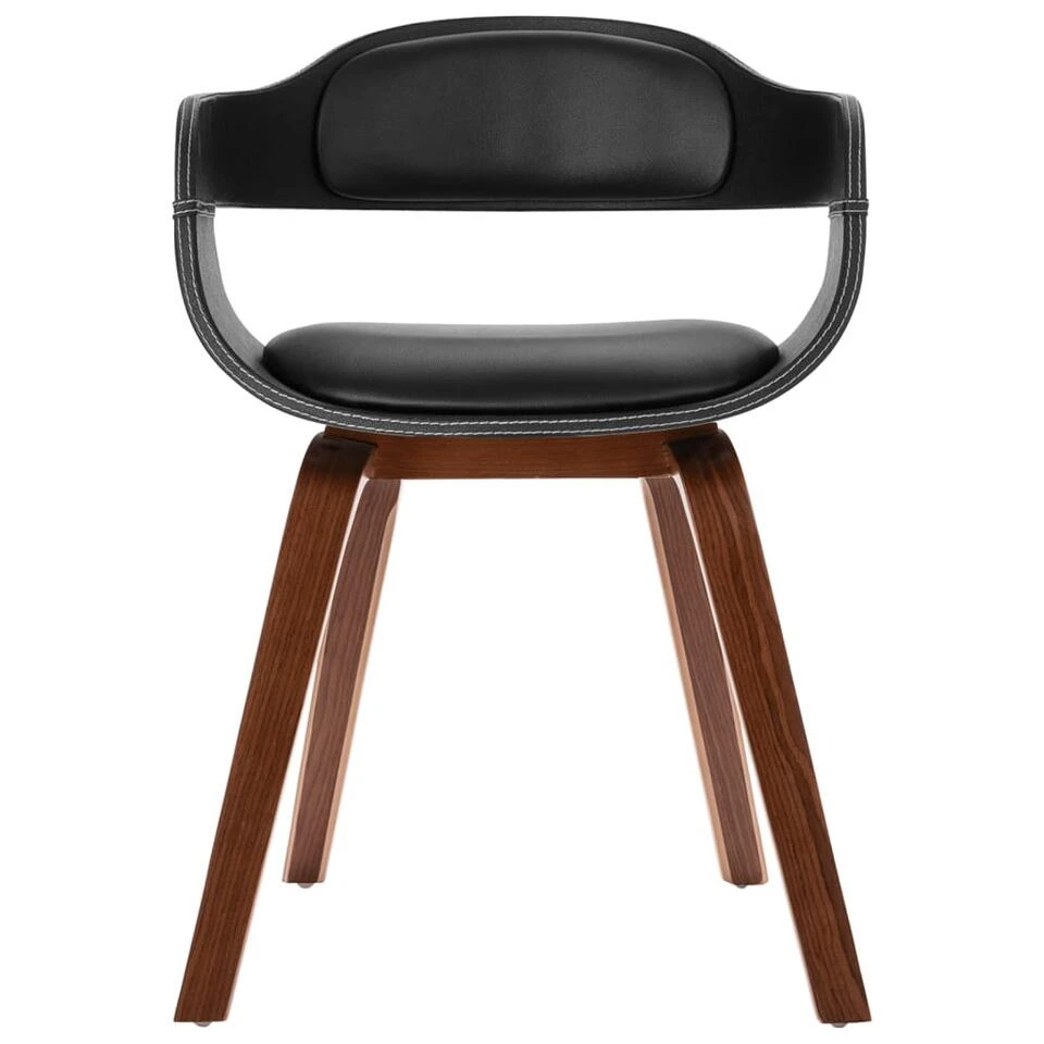 Deze eetkamerstoel heeft armleuningen en een luxueuze kunstleren bekleding. Dankzij het ergonomische ontwerp is de stoel zowel comfortabel als decoratief.