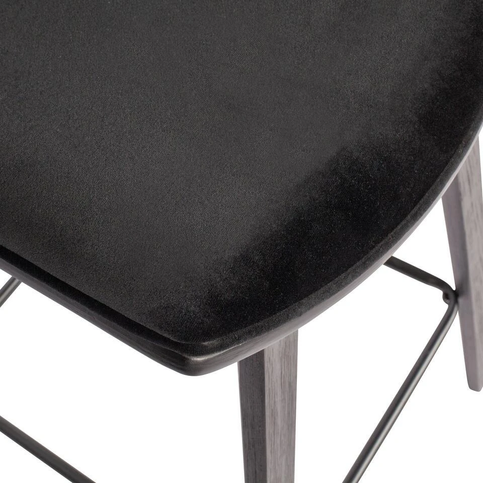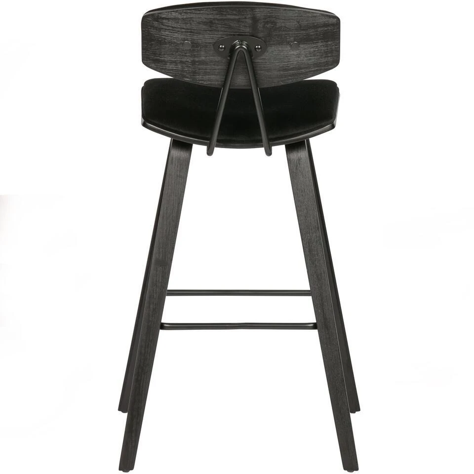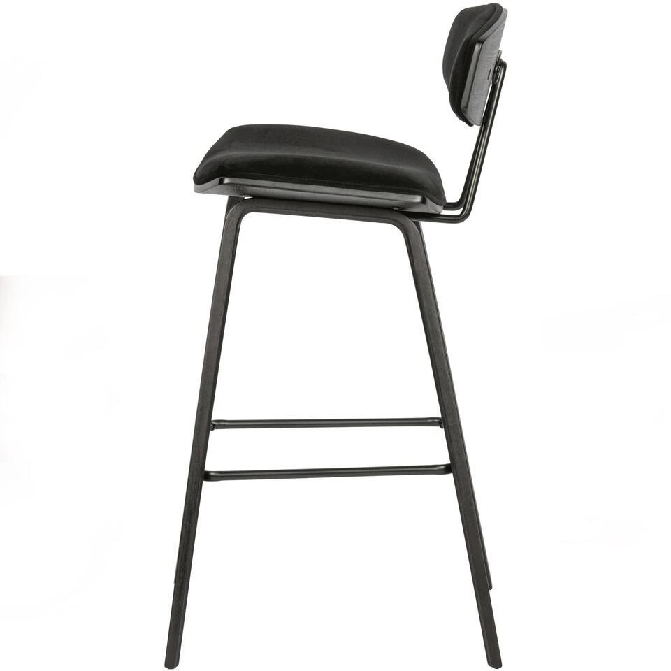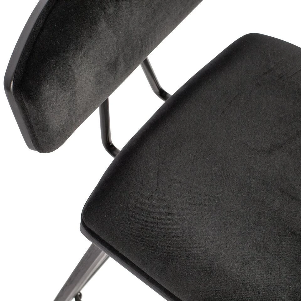 De Senn barstoel is gevormd uit multiplex afgewerkt in matzwart. De zitting en rugleuning is bekleed met een zwarte, lichtglanzende velvet. Onze Dianiet velvet is een matglanzende, royale korte velours. De gebreide stof heeft een zeer zachte, volle grip en een rijke uitstraling. Dianiet is opgebouwd uit 100% polyester en heeft een Martindale van 40.000, de stof is hierdoor slijt- en kleurvast. Gebreide stoffen zijn altijd iets rekbaar en hierdoor zeer geschikt voor een strakke meubelstoffering.